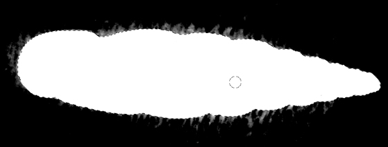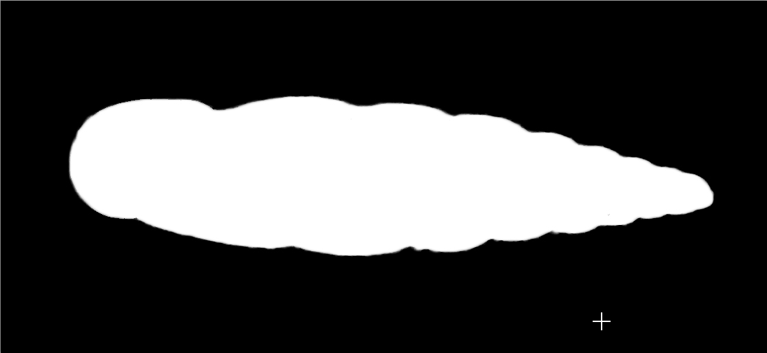 境界線の修正が一通り済んだ段階で、アルファチャンネルの形はFig. 12のようになる(Fig. 9と見比べよ)。まだ外側にゴミが残っているが、これは次の手順で自動修正できるため無視してよい。
