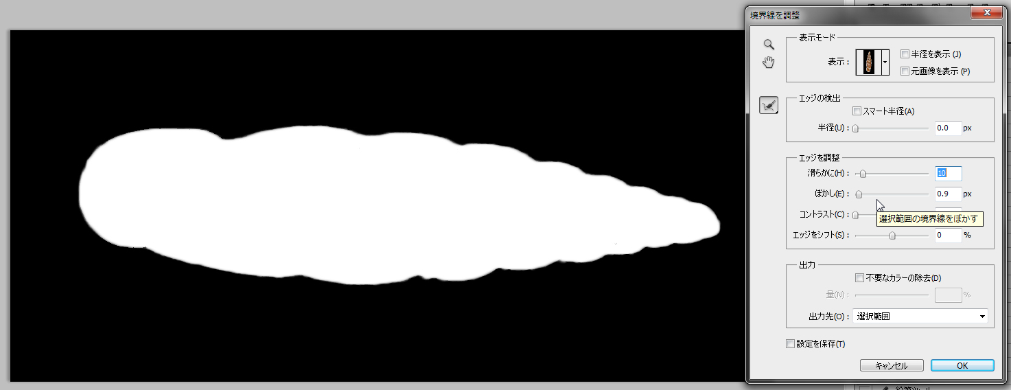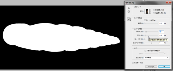 次いで、上部にある「境界線を調整...」のボタンを押し、「境界線を調整」ダイアログを表示させる。このうち「エッジを調整」メニューの「滑らかに」を10程度、「ぼかし」を0.9 px程度にそれぞれ変更してから、OKを押す(Fig. 14)。注記:これらのパラメータは標本の形状や解像度によって最適値が変わるので、目で確認すること。