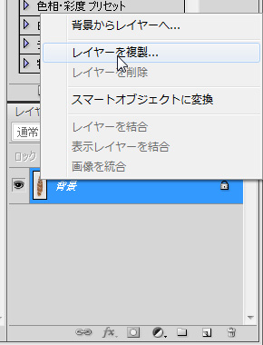 画像取り込み後にまず行うことは、元画像を破壊せずに加工するためのレイヤー複製である。「レイヤー」パネルの「背景」(1枚絵をPhotoshopで開くと最初はこの状態である)上で右クリックして、「レイヤーの複製」を実行(Fig.
