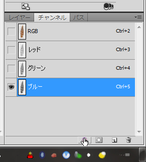 そこで、チャンネルパネル上で「ブルー」を選択してから、パネル下部の丸いボタン(チャンネルを選択範囲として読み込む)を押す(Fig.