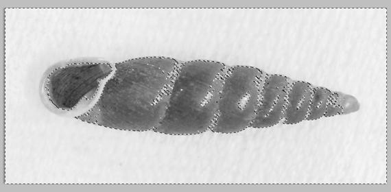 ようやく完成型が見えてきたが、まだ標本内部が部分的に透明だったり、境界線が汚かったりする(標本と背景とのコントラストが初めから高い写真が使える場合は、ここまでの手順で完成させることも可能である)。