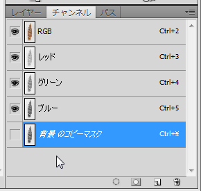 次いで、レイヤーパネル上でこの「背景 のコピー」を選択してから、「チャンネル」パネルに表示を切り替える(見つからない場合、メニュー「ウィンドウ」→「チャンネル」で表示させる)。