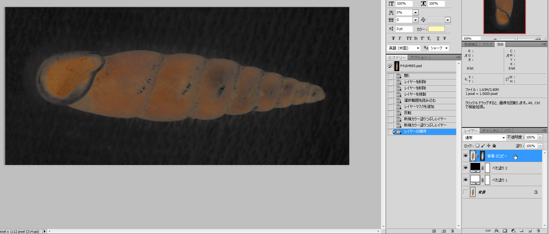 そこで、チャンネルパネルで「背景のコピーマスク」を選択してから、メニュー「イメージ」→「色調補正」→「階調の反転」を実行する。そうすることで、Fig. 7のようにチャンネルの白黒が反転し、背景が透明で標本が不透明な画像を得る。